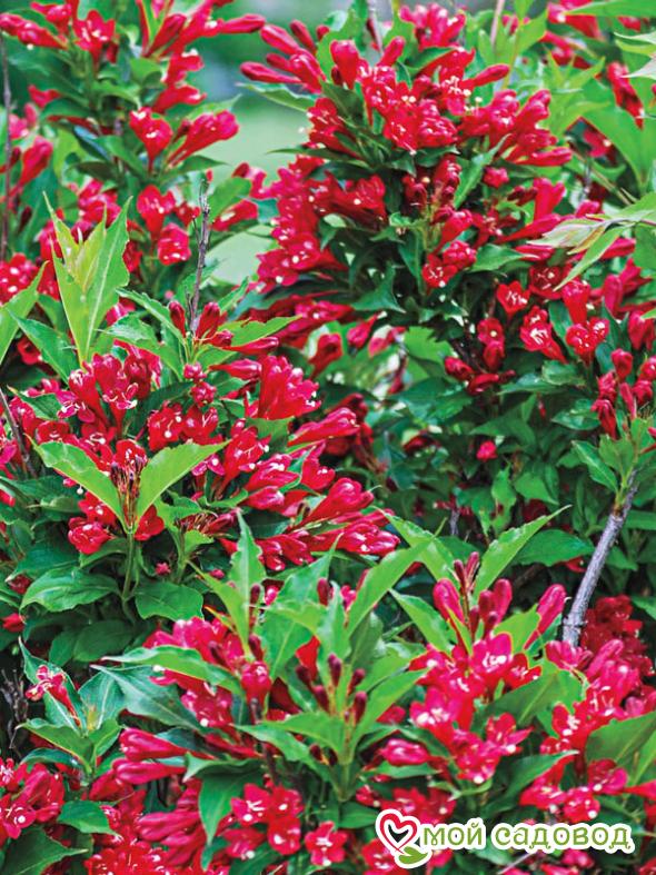 Вейгела Ред Принц (Weigela hybrida Red Prince) — невысокий раскидистый кустарник до 1,5м высотой и до 1,5м шириной. Цветет обильно в июне. Цветки многочисленные, колокольчатые, ярко-красные до 3,5см длиной, не выгорающие на солнце, собраны в соцветия по 3–4 шт., появляются на побегах прошлого года. Листья насыщенного зеленого цвета. Ежегодный прирост около 20 см. Повторное цветение в конце августа – начале сентября. Любит солнечные места, плодородные дренированные почвы. Уход за растением:  Саженцы вейгелы нужно сажать в плодородную, воздухопроницаемую почву. Сразу учитывайте, что место постоянное, так как пересадить массивный куст с пышной кроной даже при желании будет практически невозможно. Для того, чтобы растение выглядело аккуратно, его нужно стричь, удаляя больные и поврежденные ветки и формируя крону так, как вам это нужно. В первый сезон кустарник нуждается в регулярном поливе, затем вейгелу поливают только при длительных засухах.